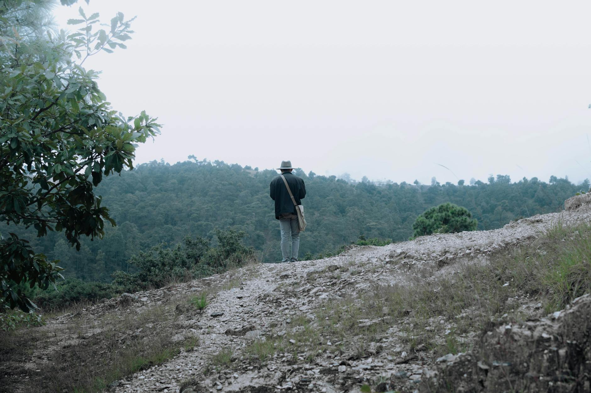 Turysta samotnie idący kamienistym leśnym szlakiem w Quiché w Gwatemali
